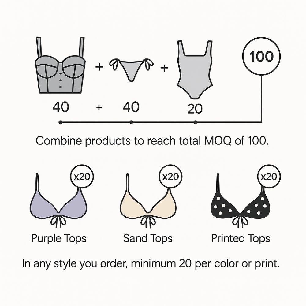 Expand your brand with a flexible range that goes beyond traditional swimwear—all with no additional minimums. Add cover-ups, activewear, or accessories to create a lineup that grows with you. Launch or scale effortlessly, with the freedom to mix, match, and build your brand your way.